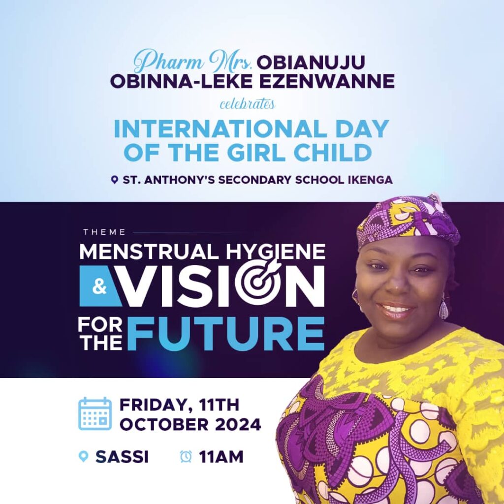 At the 2024 International Day of the Girl Child celebration, Pharm Mrs. Obianuju Obinna-Leke Ezenwanne, Pharmacist Director of Y-bae Pharmacy and Stores, Ngozika Estate, Awka, and Assistant Director in the Federal Ministry of Health, delivered an insightful lecture at St. Anthony’s Secondary School, Ikenga community, Anambra State. The event focused on “Menstrual Hygiene and Vision for the Future.”