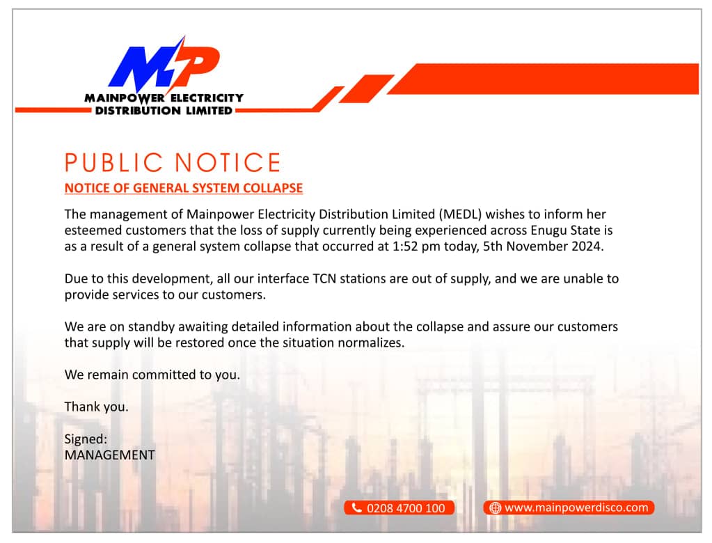 The Enugu Electricity Distribution Company PLC (EEDC), in a statement signed by its Head of Corporate Communications, Emeka Ezeh, notifies customers of a recent collapse of the national grid.