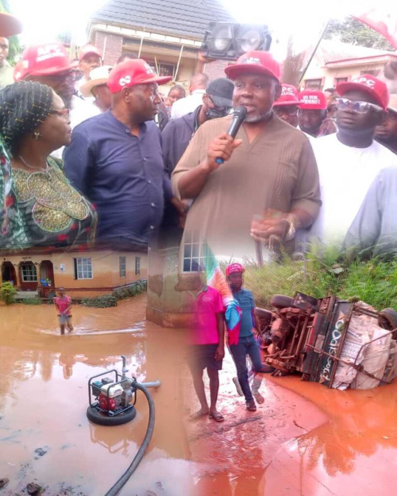 Arriving at the disaster scene in the company of top APC officials, Ukachukwu inspected the submerged homes, collapsed fences, and affected neighbourhoods along the Ogidi–Onitsha Highway, where commuters were stranded as the road became nearly impassable.
