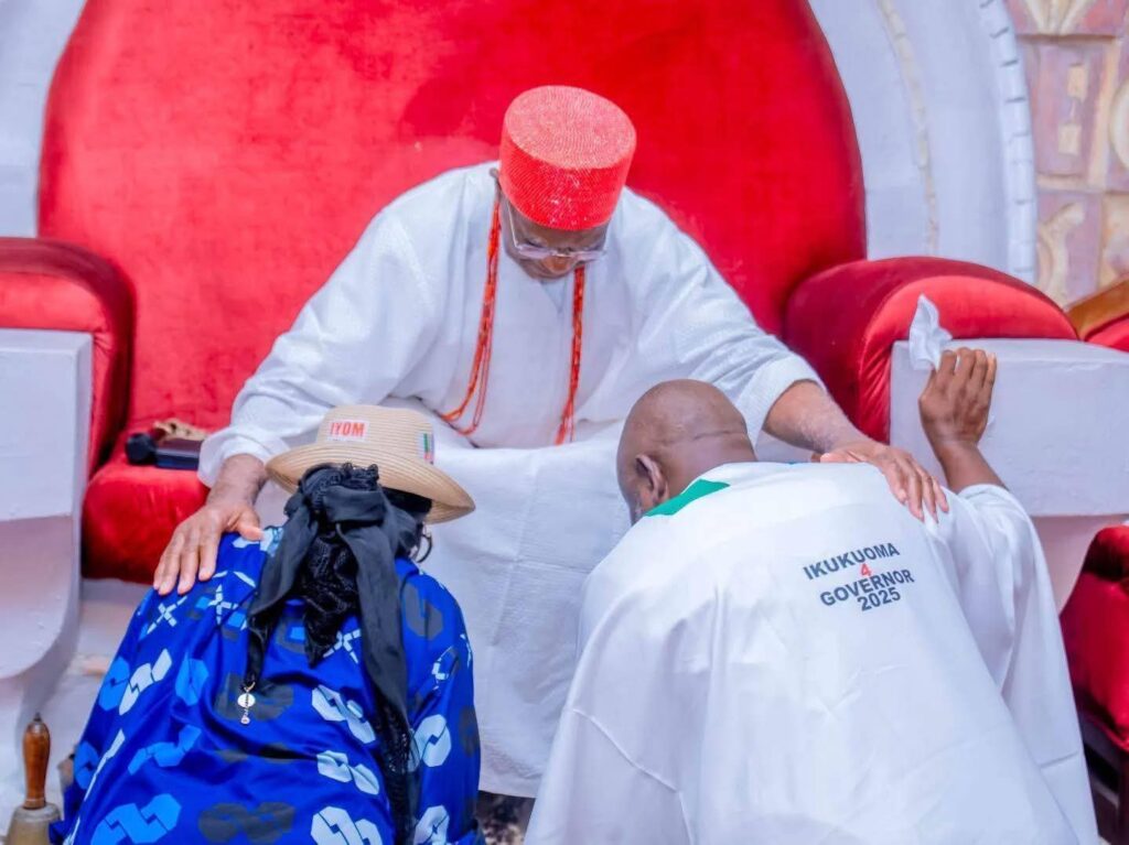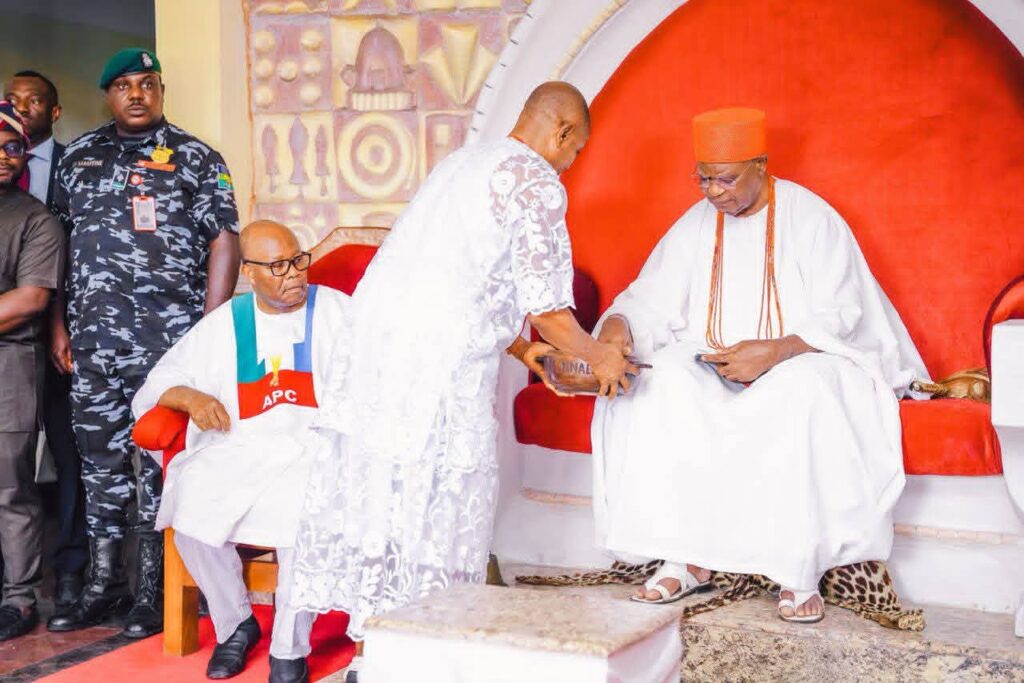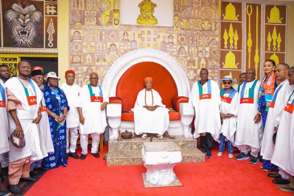 During the visit, the Great Obi of Onitsha, His Majesty Igwe Nnaemeka Alfred Achebe (Agbogidi), offered royal prayers and blessings to the APC governorship and deputy governorship candidates, Prince Dr. Nicholas Ukachukwu (Ikukuoma) and Senator Uche Lilian Ekwunife (Iyom).