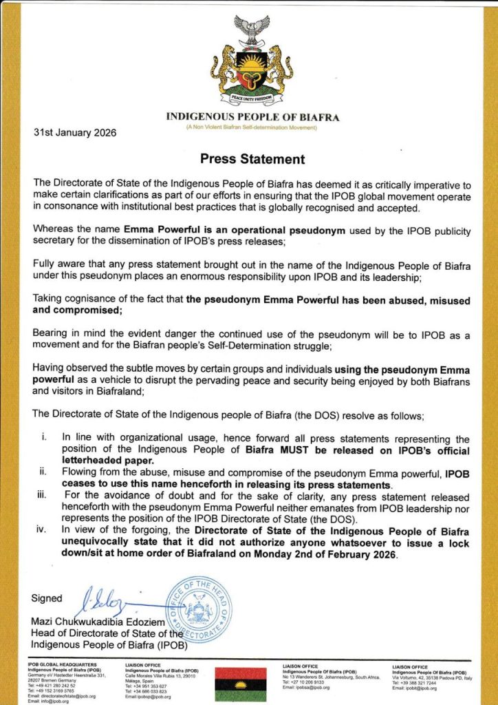 The Indigenous People of Biafra (IPOB) has officially banned the use of the pseudonym “Emma Powerful” and directed that all its authorised press statements must henceforth be issued exclusively on the organisation’s official letterheaded paper.